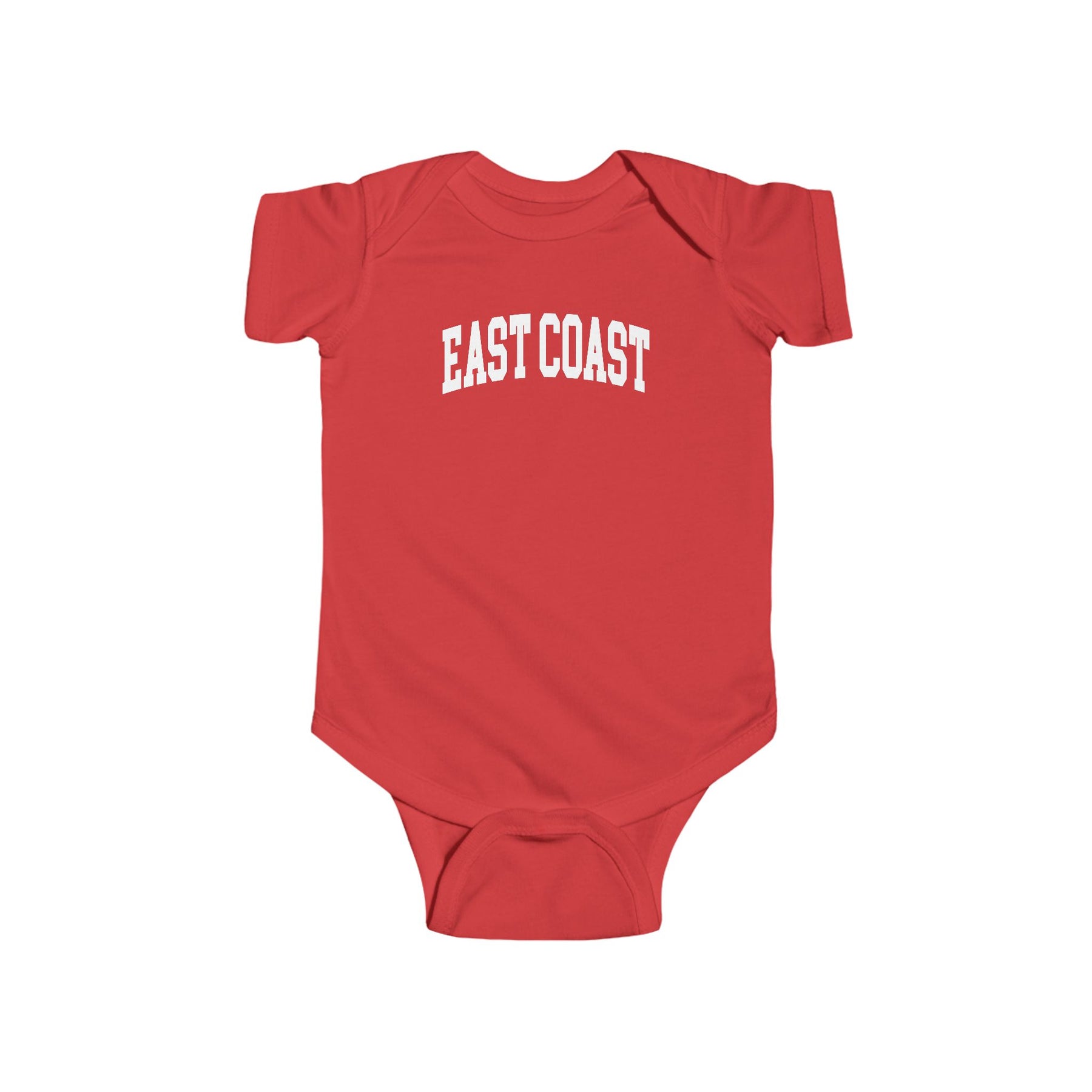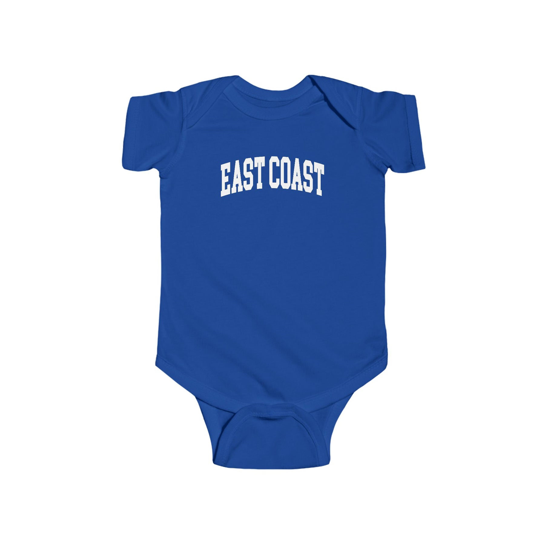 This super soft East Coast baby bodysuit is 100% combed cotton and designed to be comfortable next to delicate baby skin. The lap shoulders and reinforced three snap closure makes for ease of dressing. Tear away label.