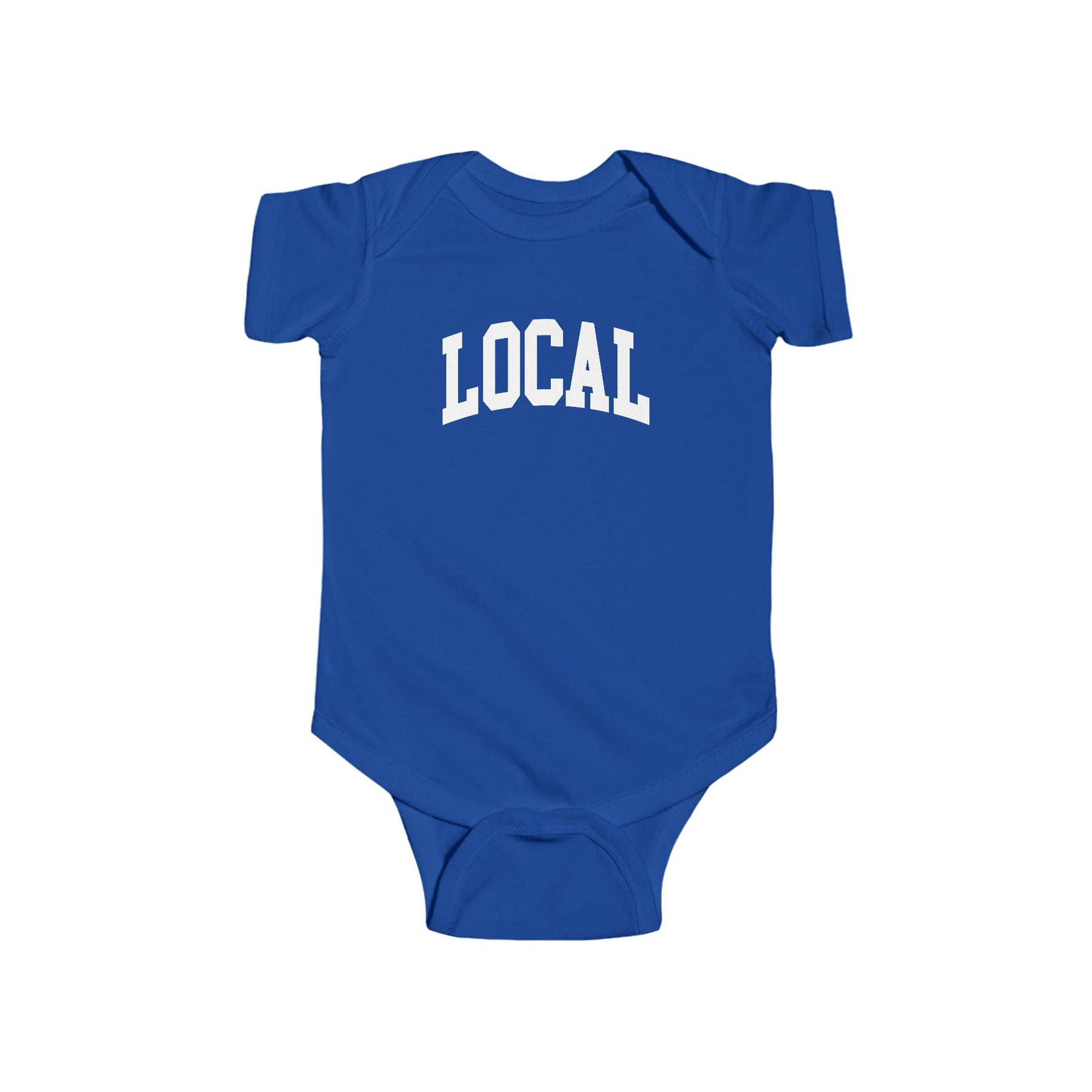 This super soft "Local" baby bodysuit is 100% combed cotton and designed to be comfortable next to delicate baby skin. The lap shoulders and reinforced three snap closure makes for ease of dressing. Tear away label.